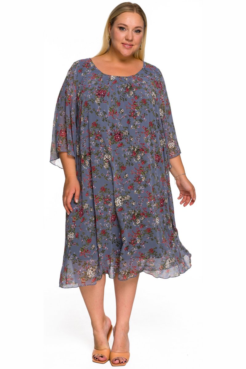 Платье с защипами по горловине, шифон принт цветочный на графитовом