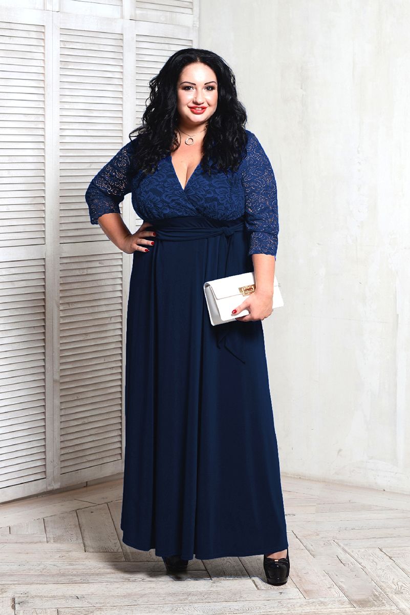 Платье длинное с кружевным лифом, рукав 3/4 синее