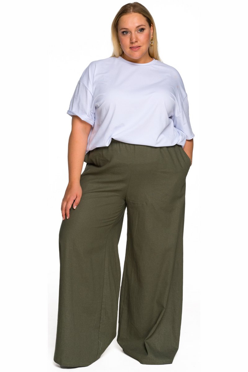 Брюки широкие из льна с карманами, цвет хаки