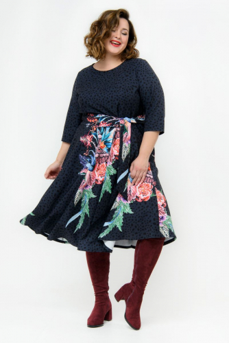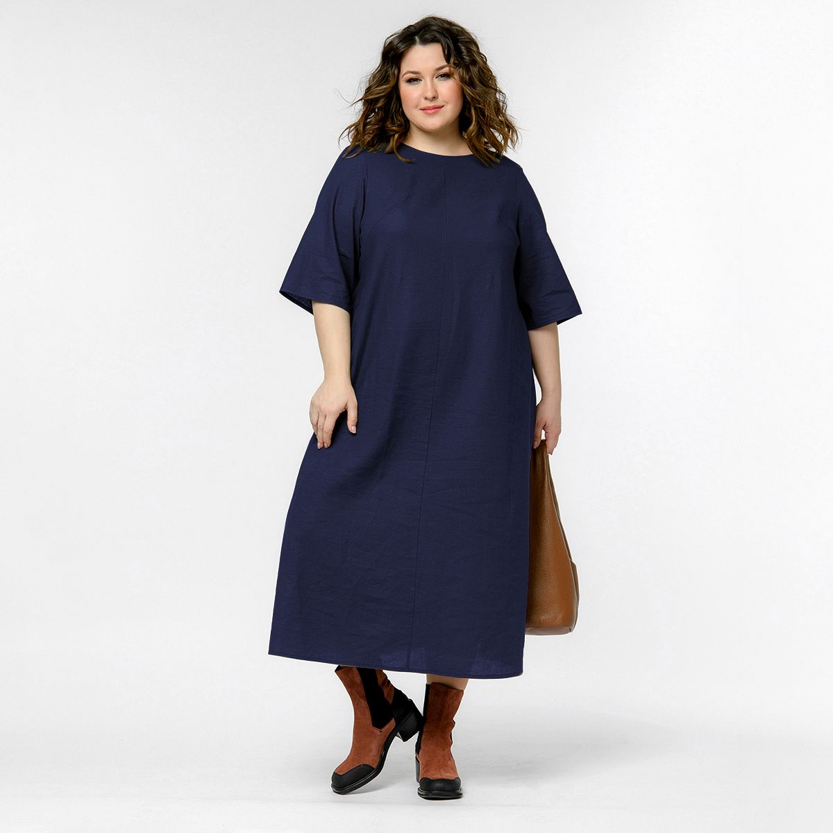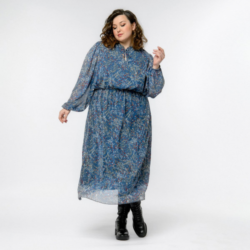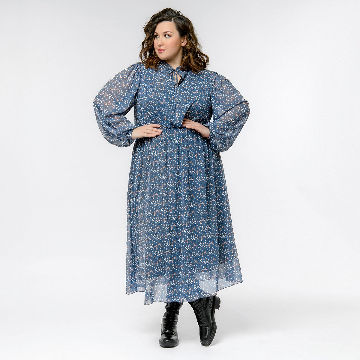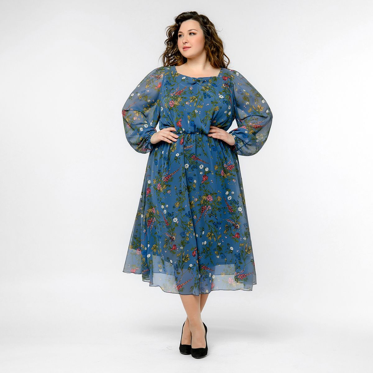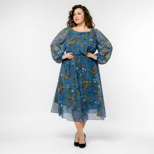 Платье А-силуэта, миди, шифон, принт темно-синий