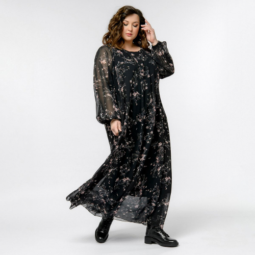 Платье длинное из шифона, принт "пудровые цветы", черный