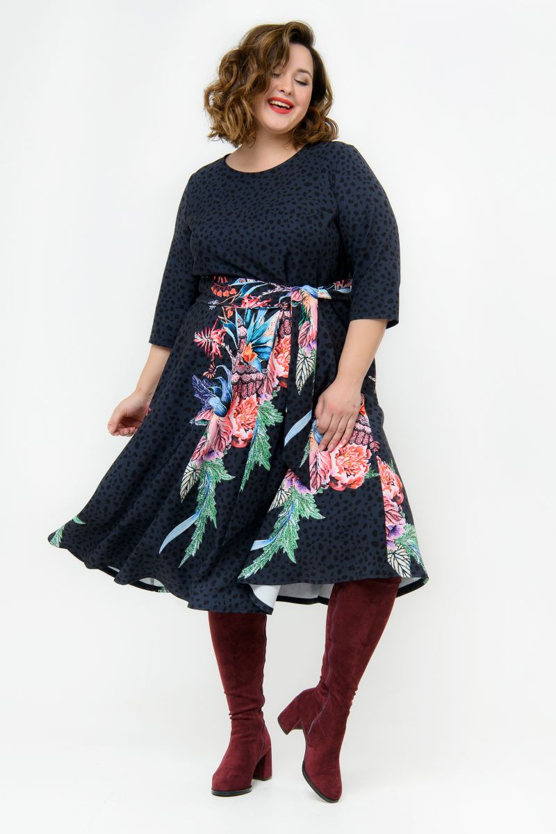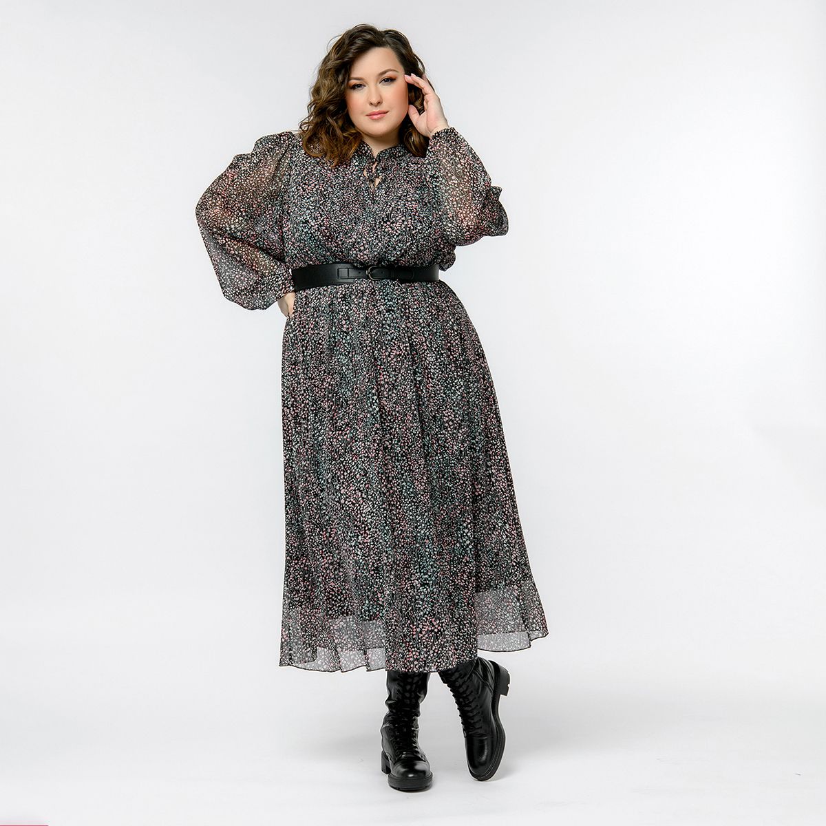 Платье А-силуэта, миди, шифон антрацитовый в мелкий цветочек