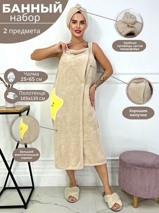 Комплект женский для бани и сауны "Summer"-БЕЖЕВЫЙ микрофибра 2 пр. (парэо + чалма)