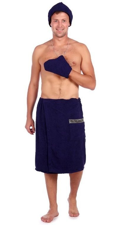 Комплект мужской для бани и сауны СИНИЙ махровый 3 пр. (накидка-парэо, чалма, рукавица) хлопок 100%