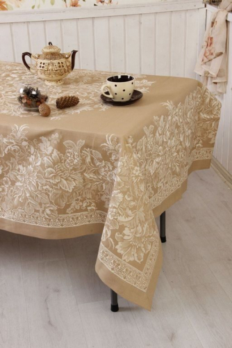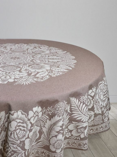 Скатерть Премиум круглая "Цветы"-бежевый D 178 см. п/лен