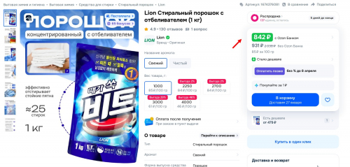 LION Beat 1kg (Pouch) Стиральный порошок с отбеливателем