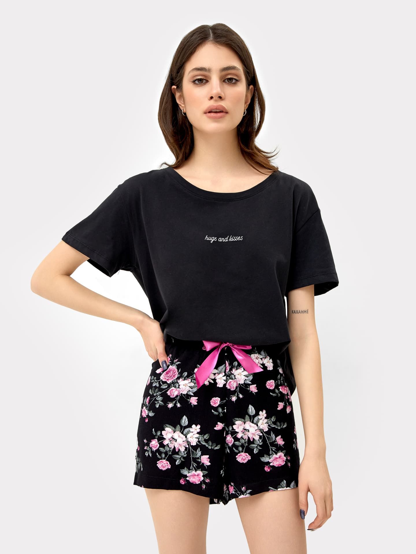 КОМПЛЕКТ ЖЕНСКИЙ (ФУТБОЛКА, ШОРТЫ) 592479 592479 черный +цветы фуксия на черном 18113 Mark Formelle