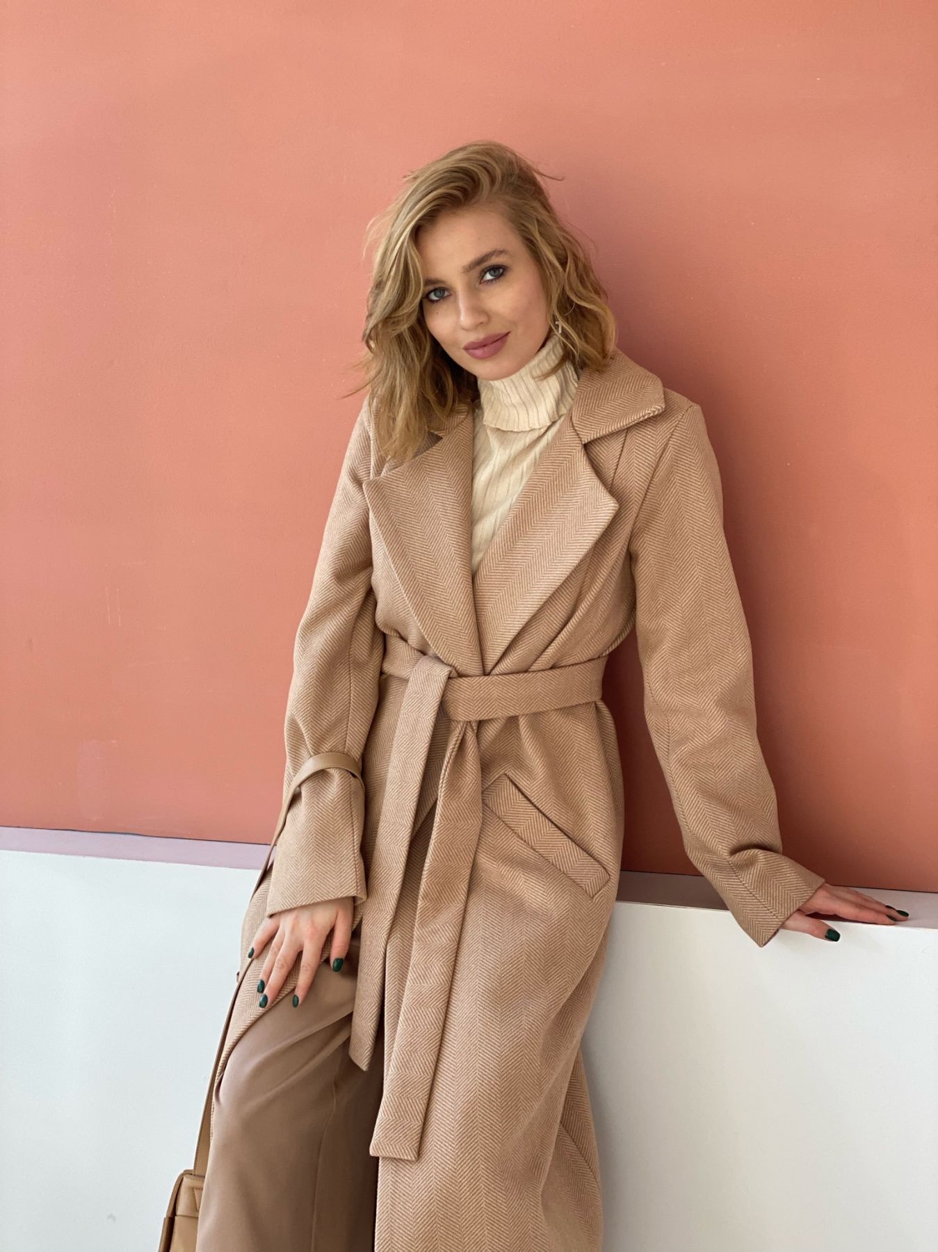 4819 Пальто классическое удлинённое в бежевую "ёлочку"