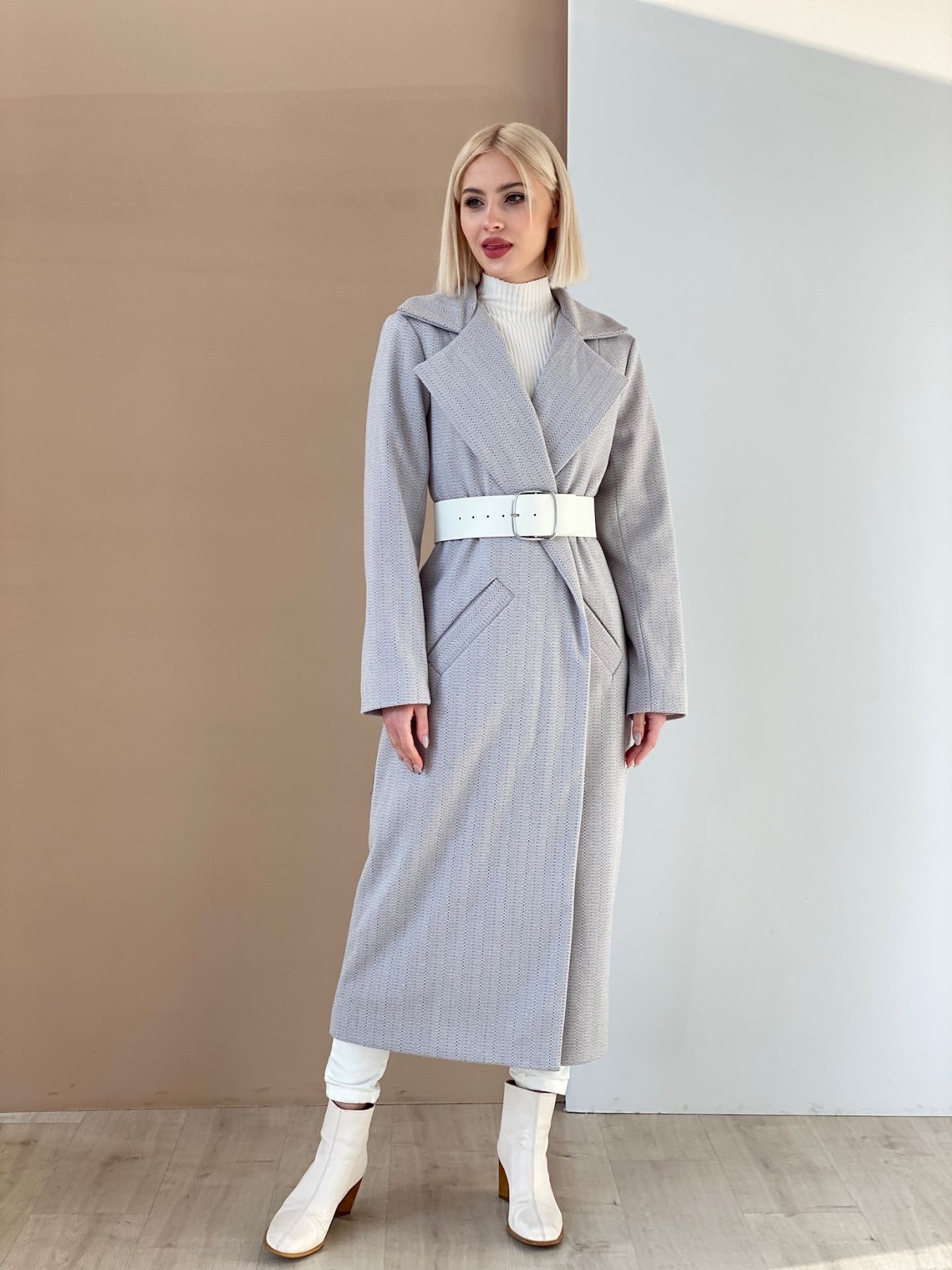 5695 Пальто классическое удлинённое из шерсти серое в полосочку-ёлочку