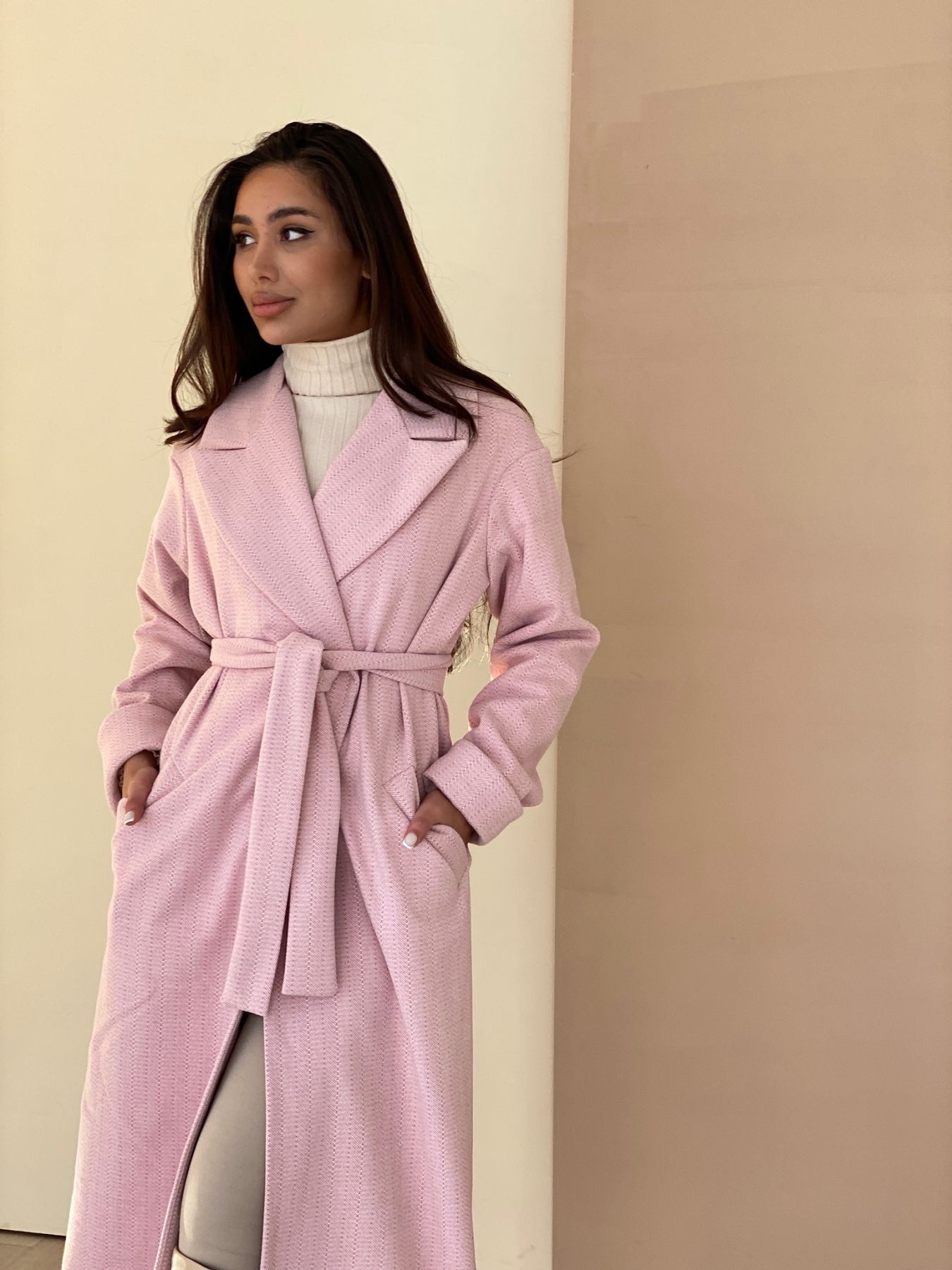 5764 Пальто Дива удлинённое в пудровую полосочку-ёлочку