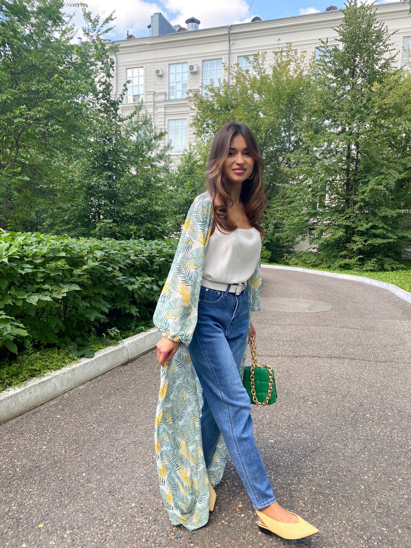 6946 Накидка длинная с принтом "листья"