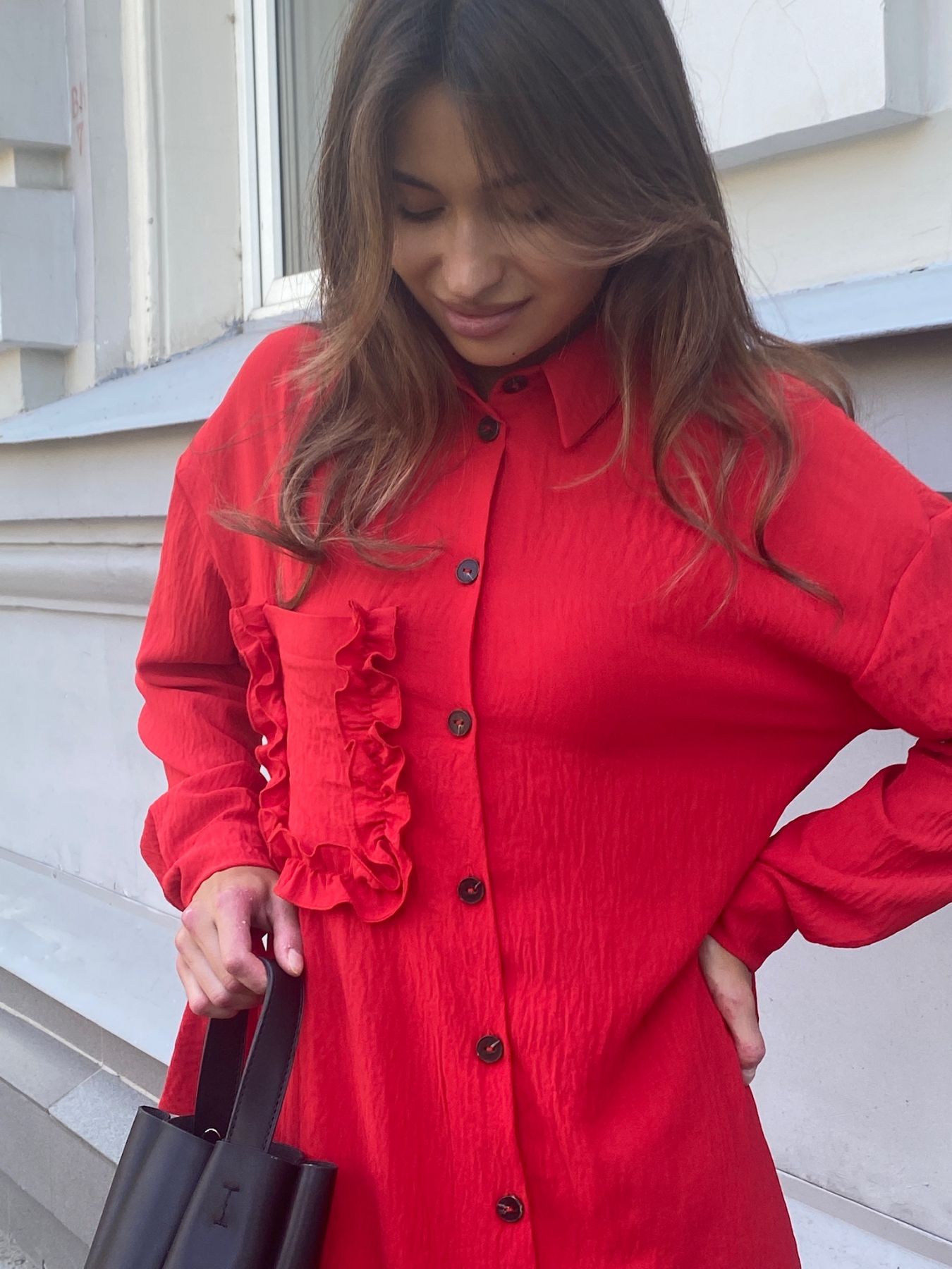 6960 Платье-рубашка с накладным карманом красное