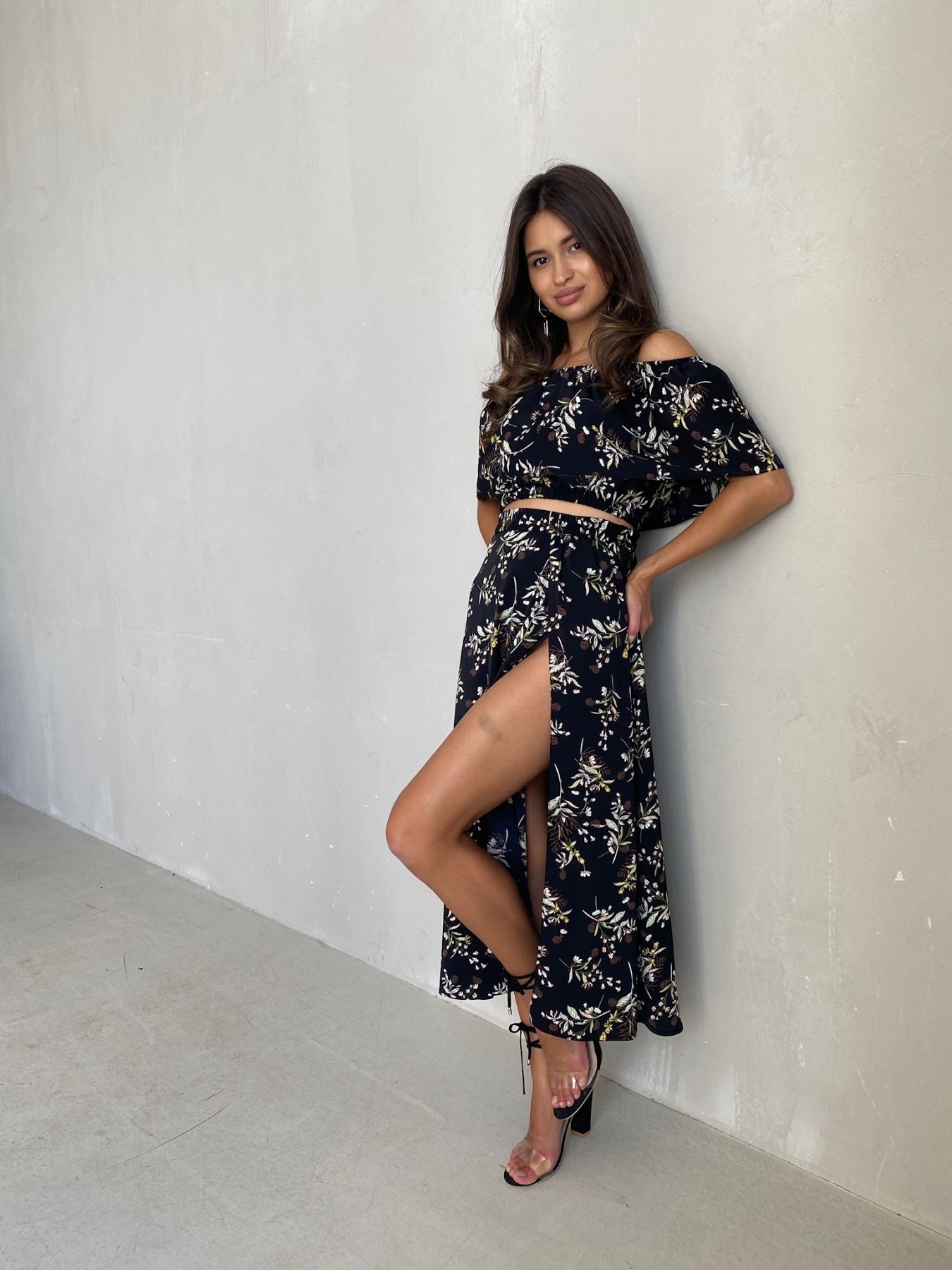 6944 Комплект из топа с воланом и юбки-миди чёрный с принтом "floral"