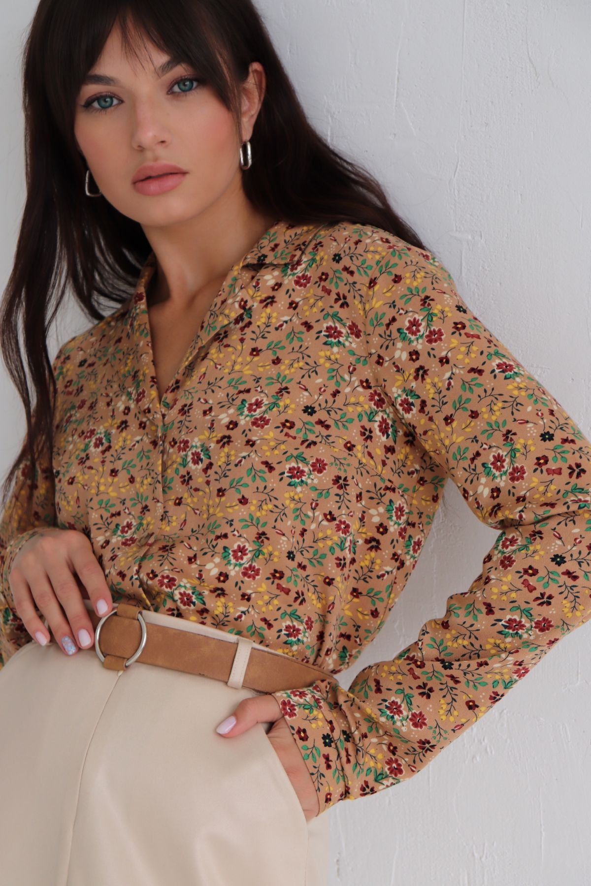 7030 Блуза с английским воротником бежевая в цветочек