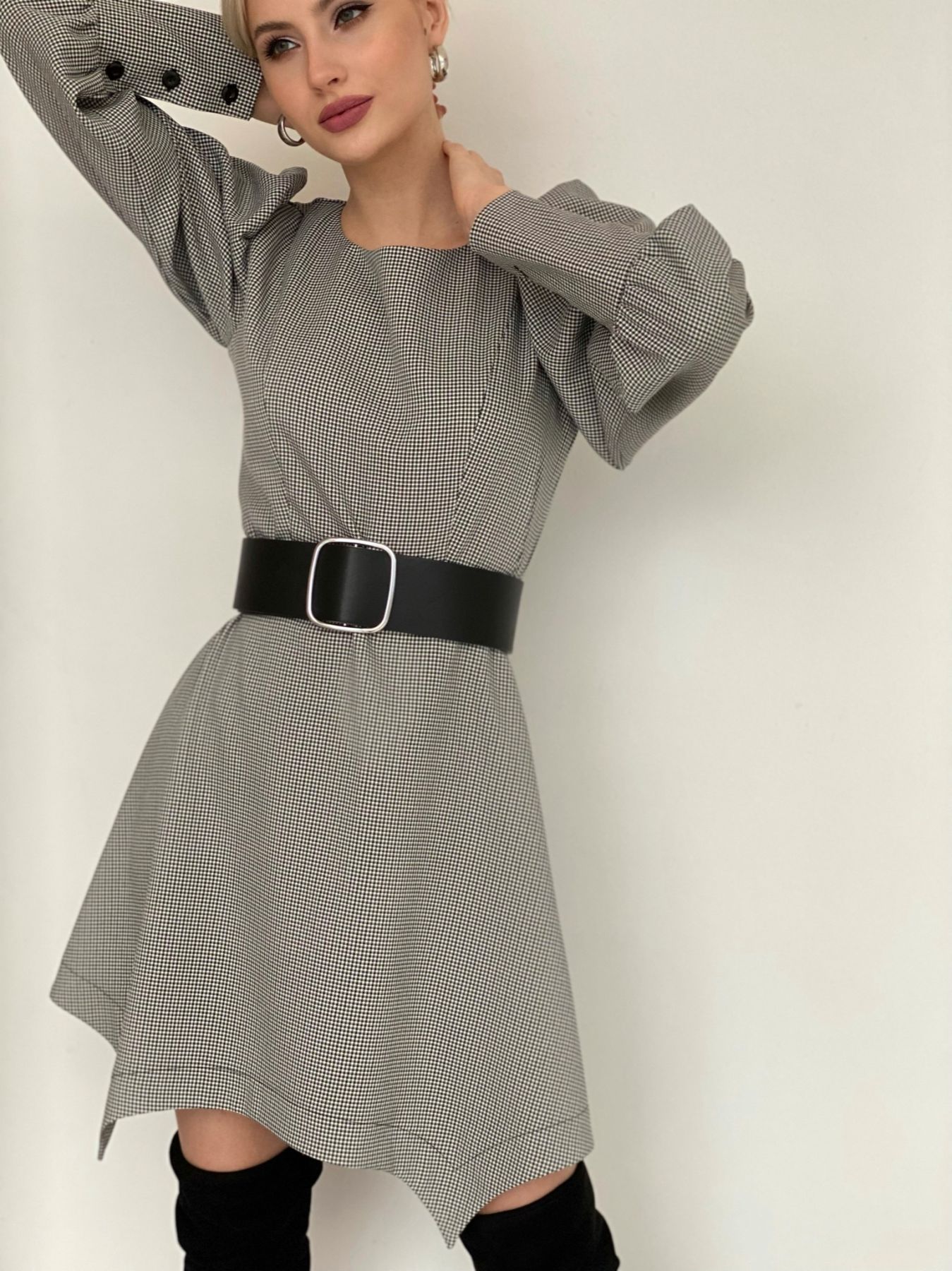5365 Платье с высокими манжетами и фигурным низом серое в клеточку
