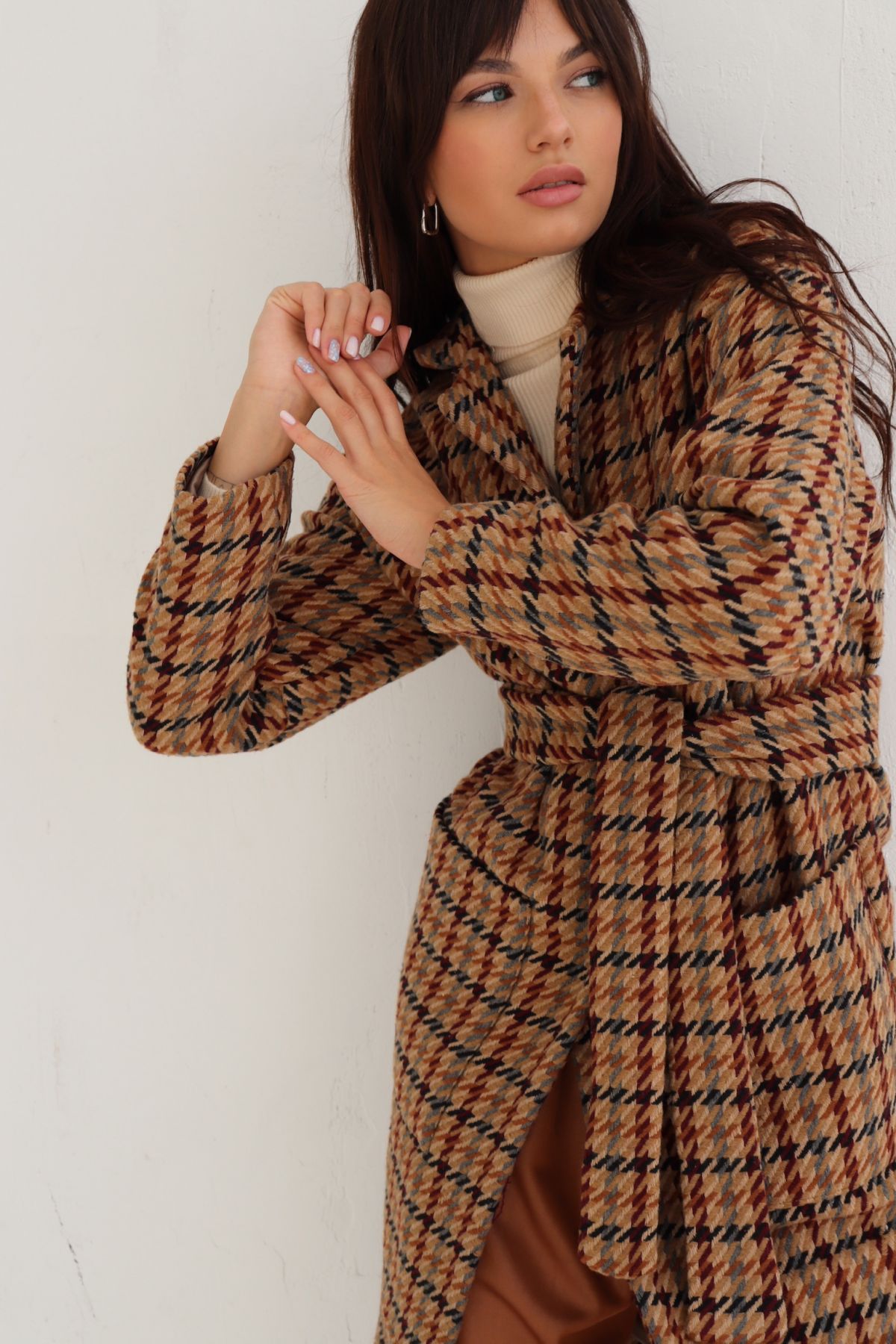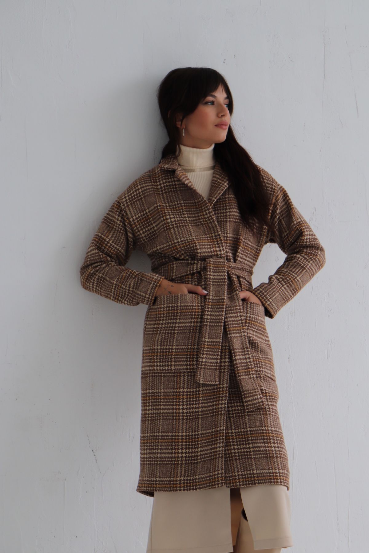 6225 Пальто-кокон с накладными карманами в гусиную лапку бежево-коричневое