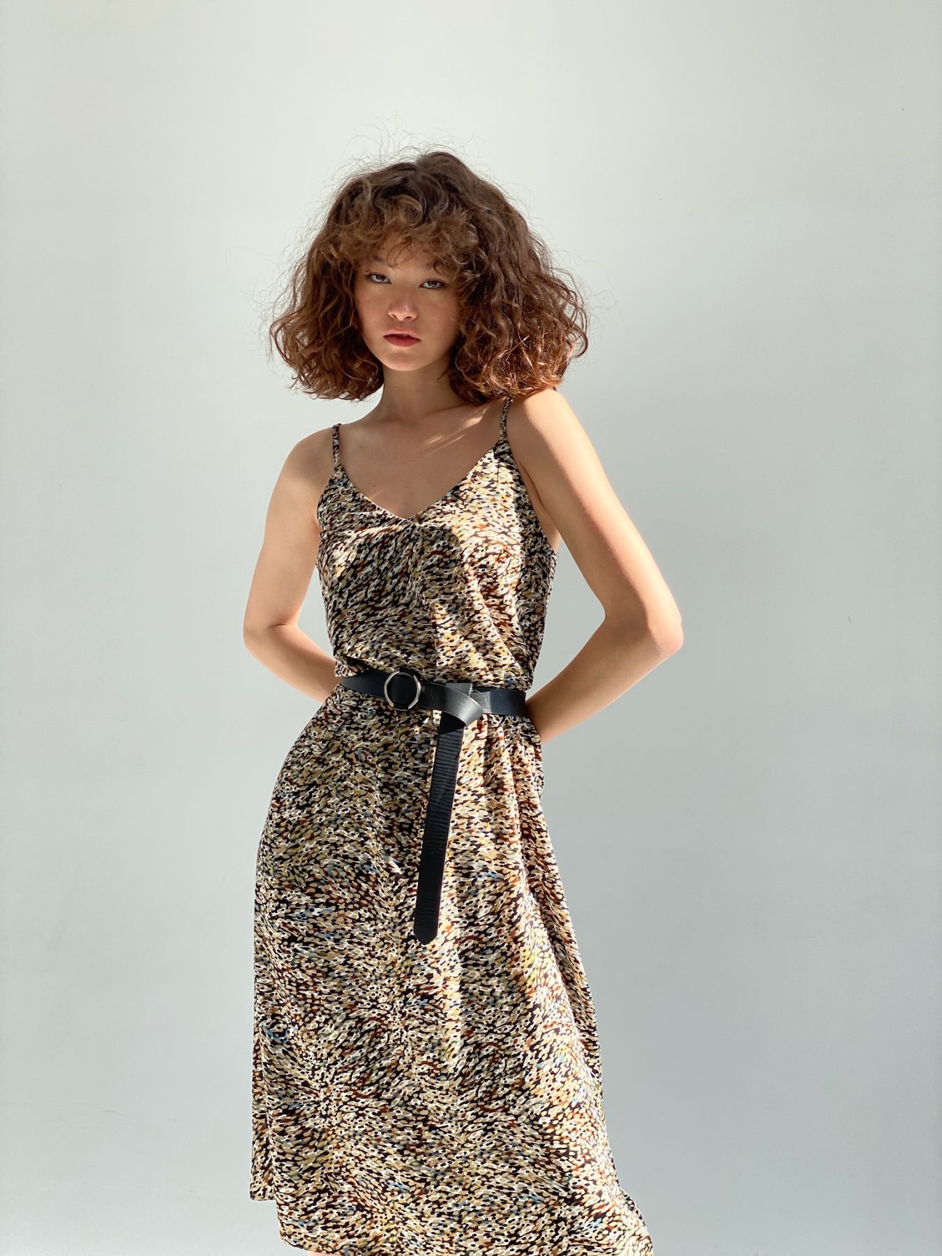 6188 Платье-комбинация с мелким принтом в бежево-коричневых тонах