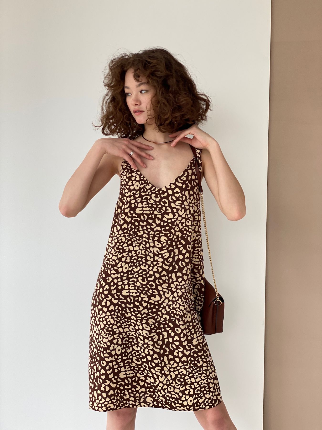 6330 Платье с узлами на бретелях шоколадное с пятнышками
