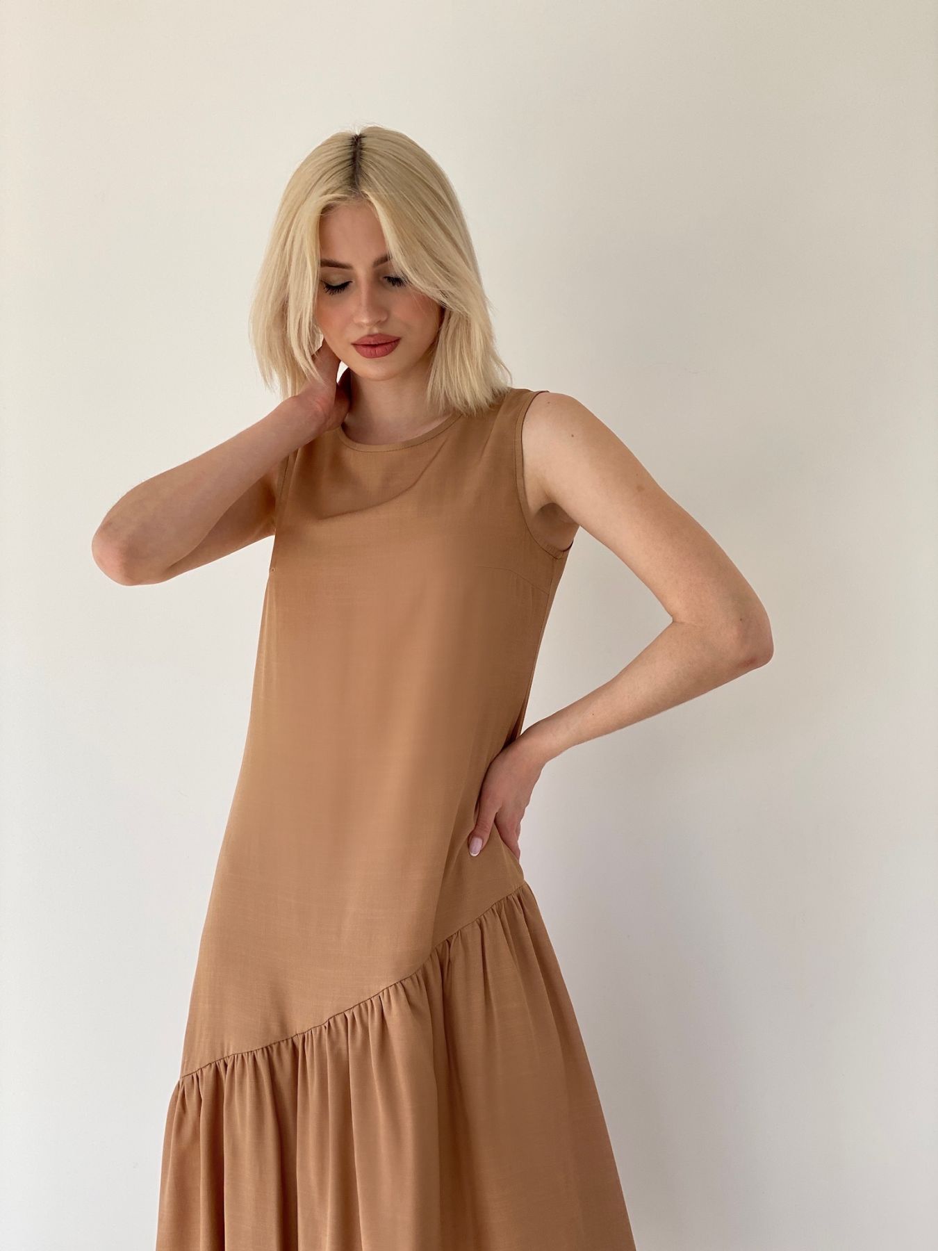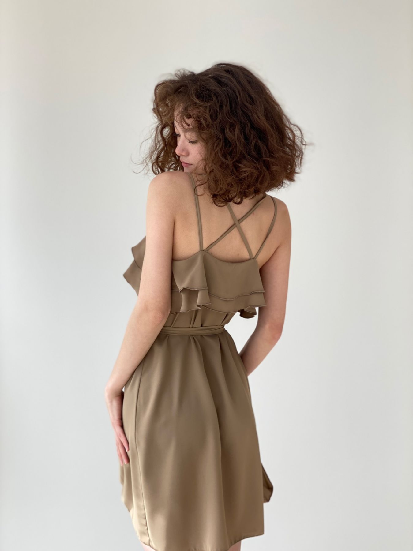 6391 Платье с асимметричным воланом тёмно-бежевое