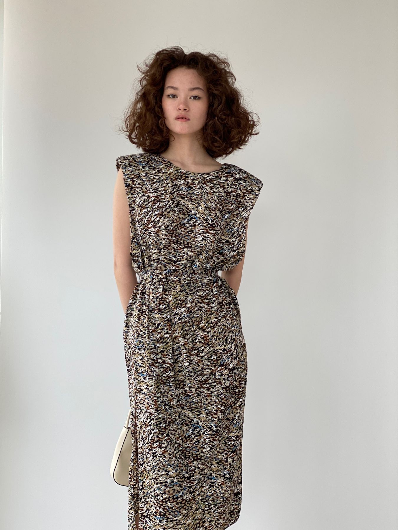 6347 Платье с объёмными плечами в коричневых тонах с принтом