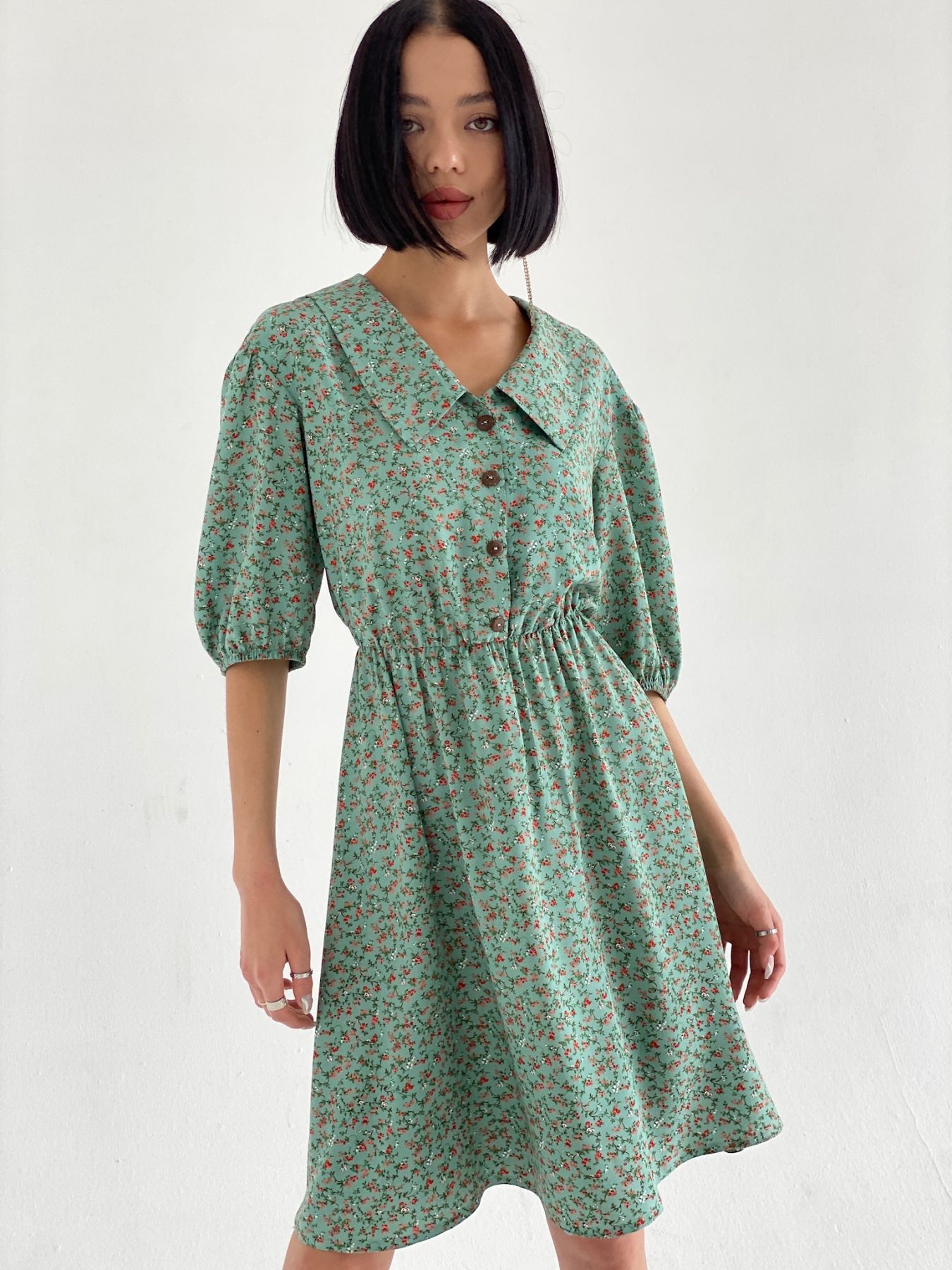 6491 Платье с отложным воротником фисташковое в цветочек
