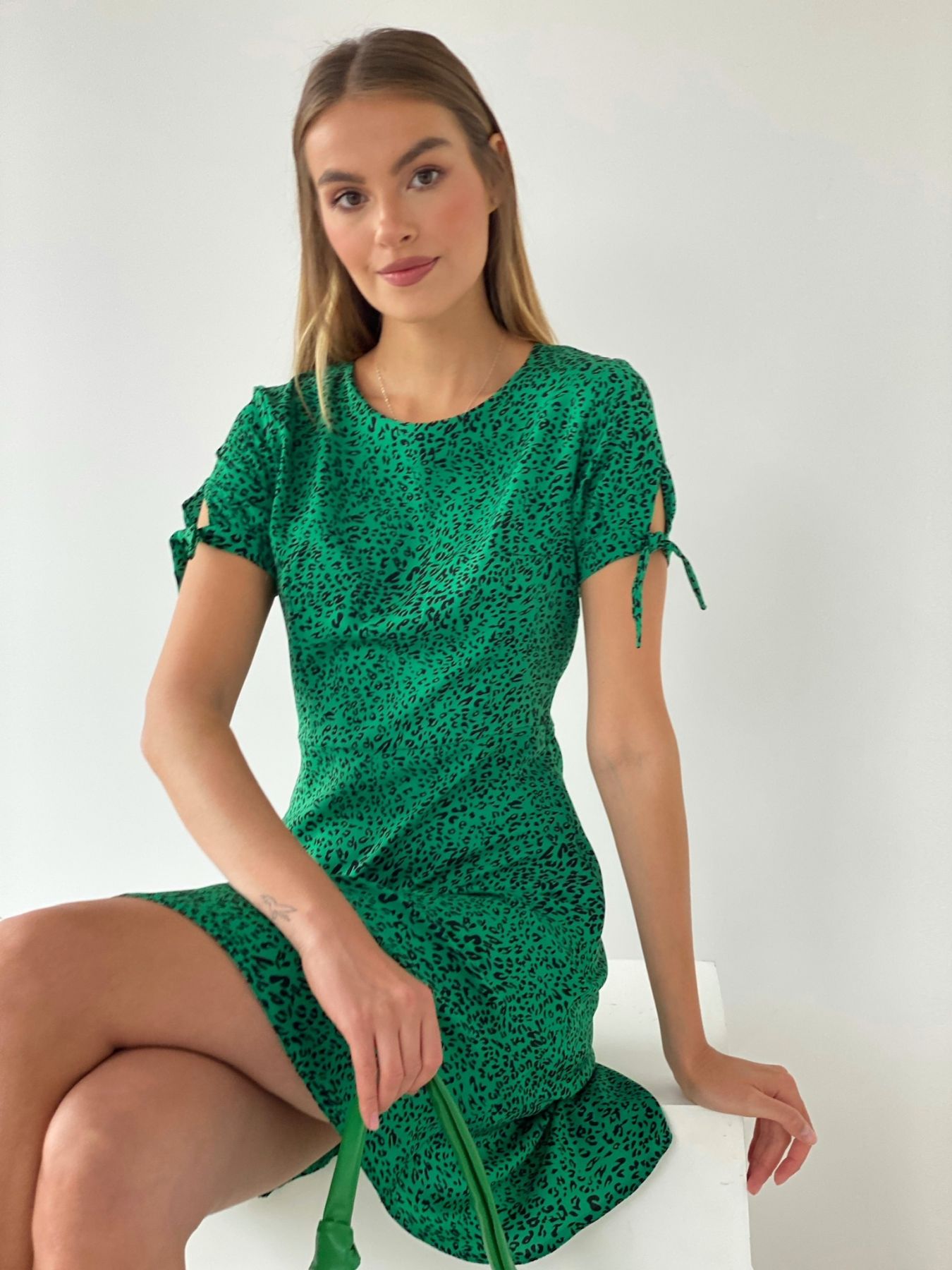6593 Платье с завязками на рукавах зелёное с принтом