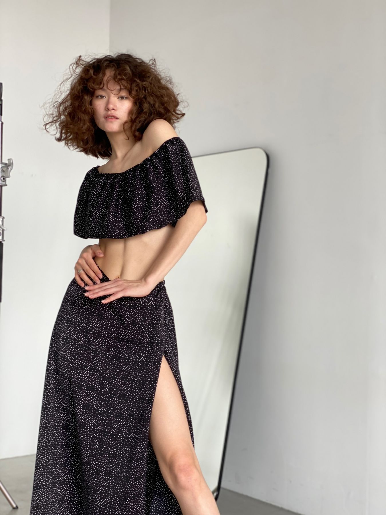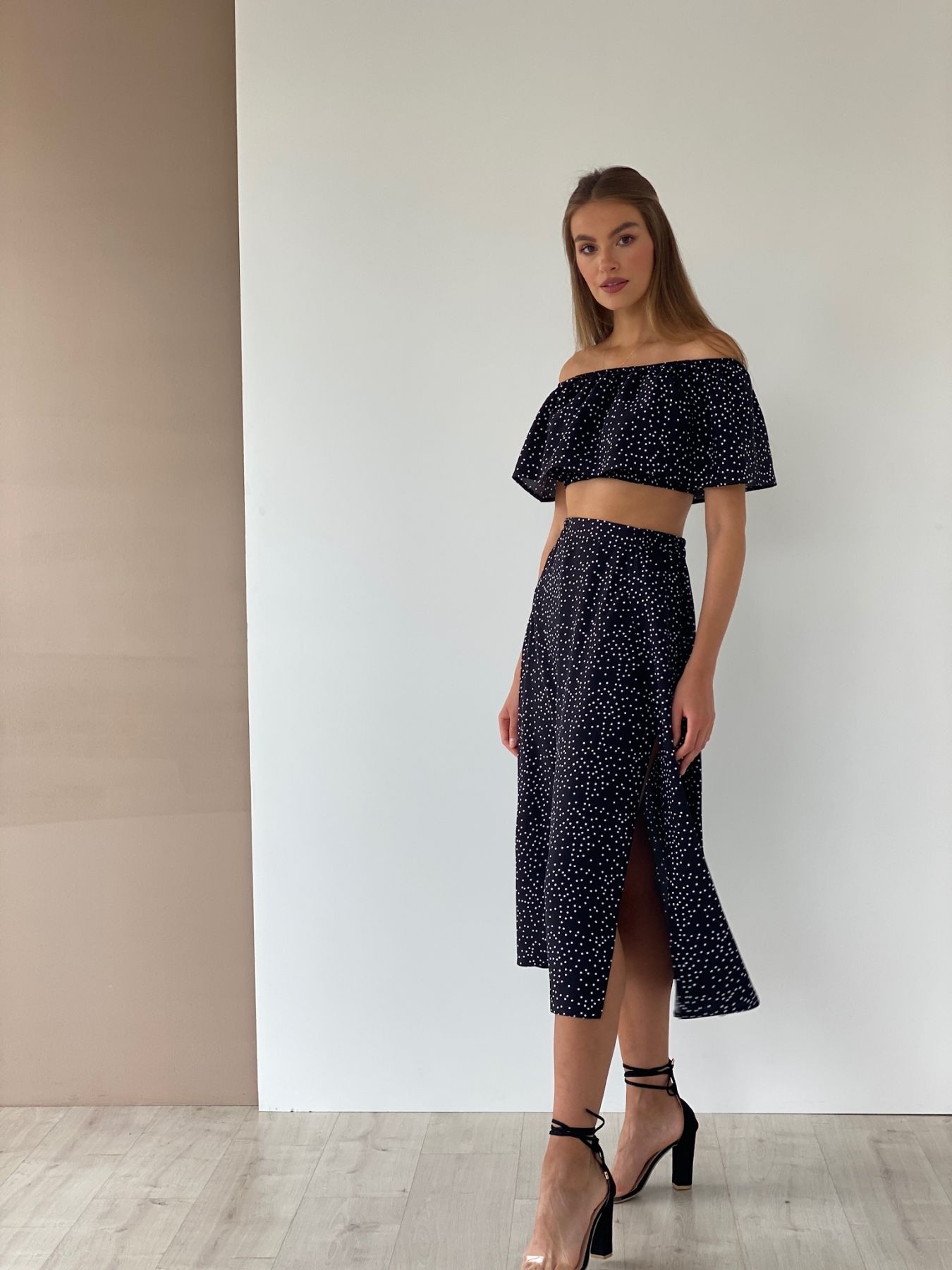 6363 Комплект из топа с воланом и юбки-миди чёрный в горошек