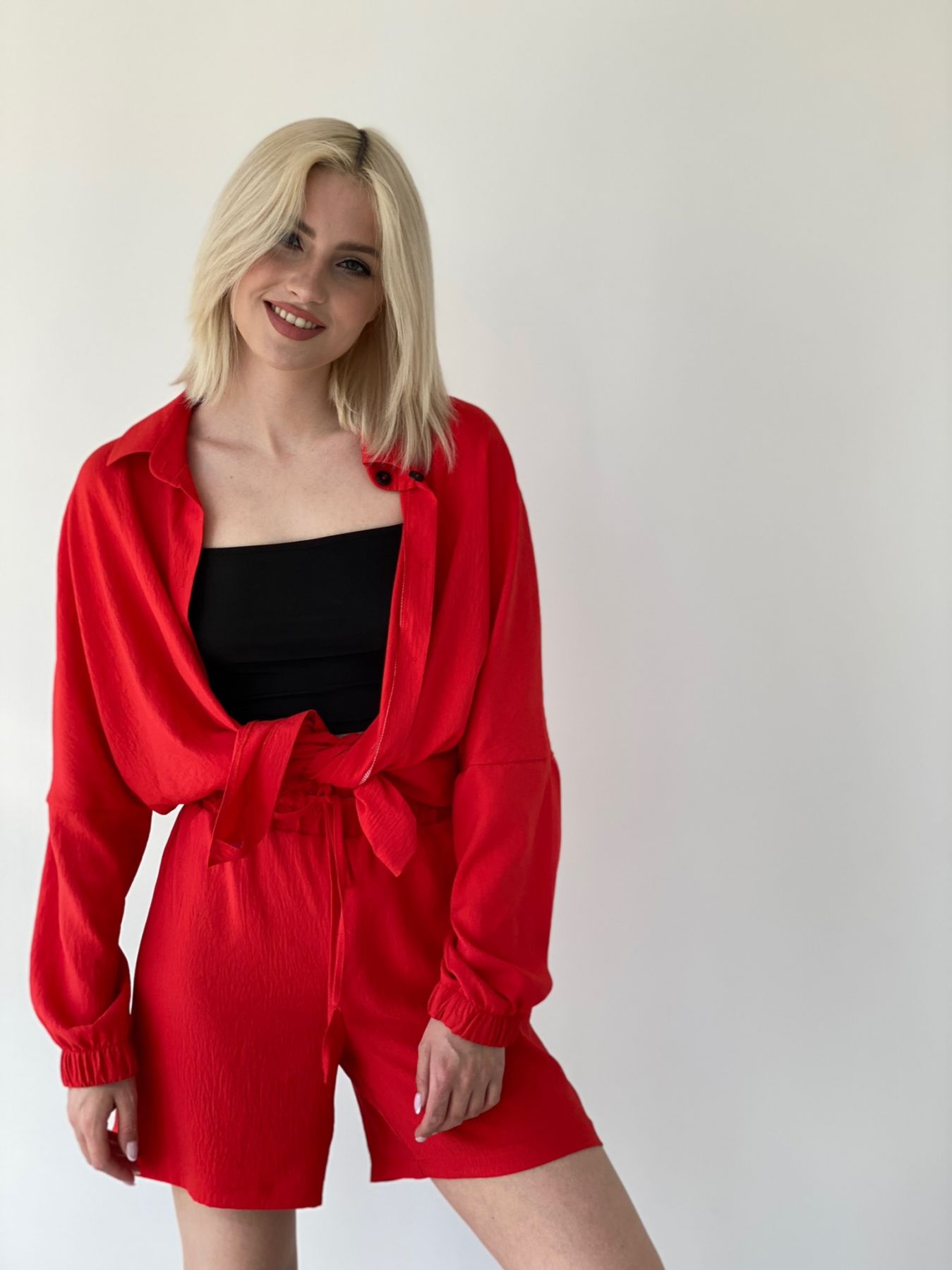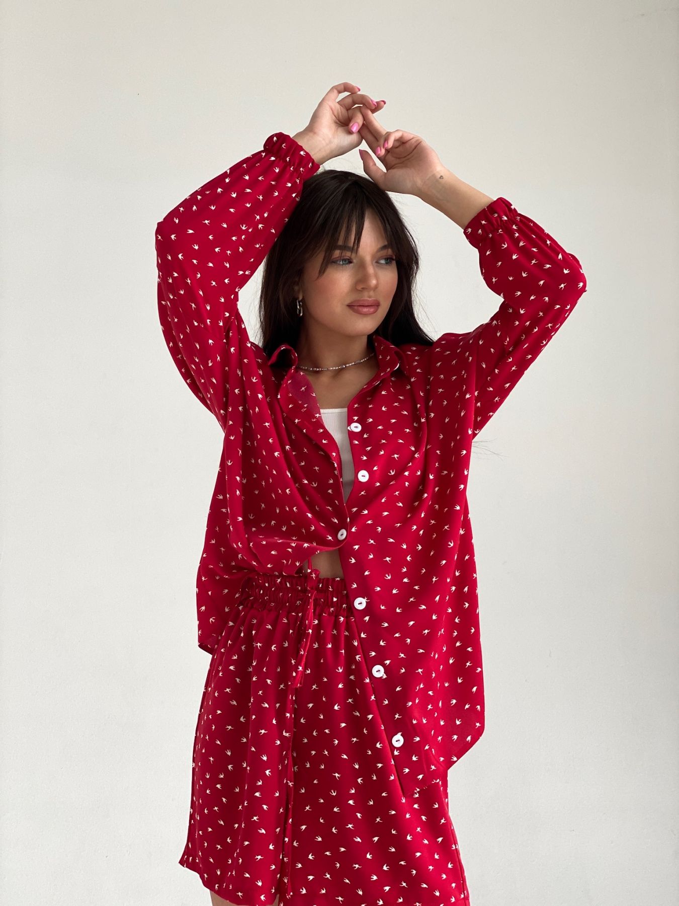 6565 Костюм в пижамном стиле с шортами красный с птичками