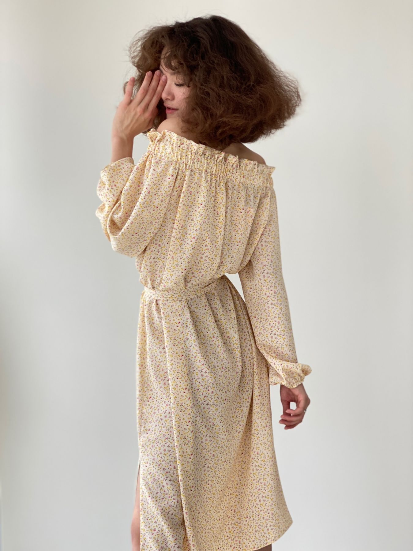 6346 Платье-трапеция с открытыми плечами кремовое в цветочек
