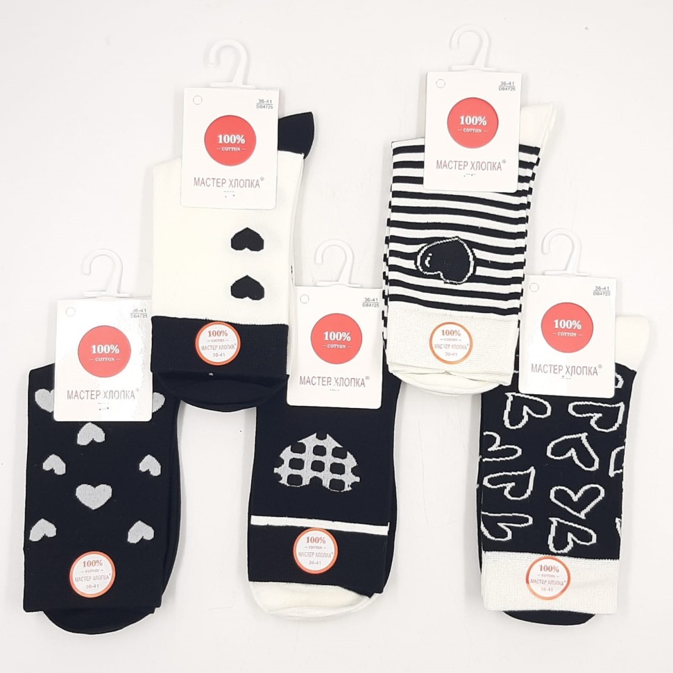 Упаковка из 10 шт МАСТЕР ХЛОПКА Носки женские Высокие Хлопок СЕРДЕЧКИ (черно-белые) (36-41) (DB4725) К10