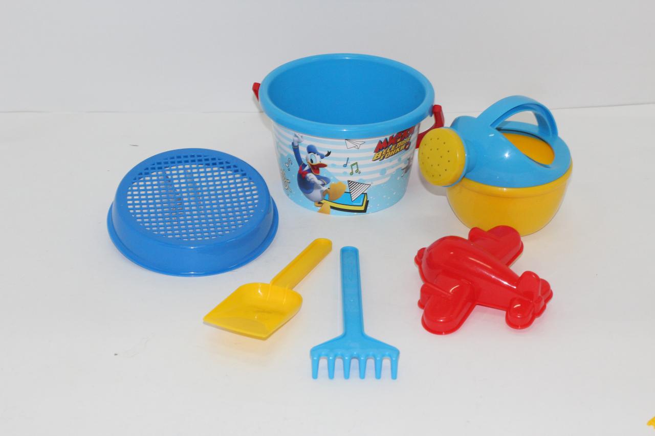 Набор Disney «Микки и Весёлые гонки» №8: ведро среднее с наклейкой, ситечко, лопатка, грабельки, формочка (самолёт), лейка малая №4