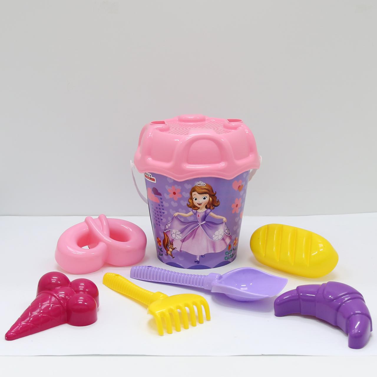 Набор Disney «София Прекрасная» №2: ведро большое с наклейкой, ситечко большое №3, лопата №6, грабли №6, формочки (мороженое + пирожок + крендель + рогалик)