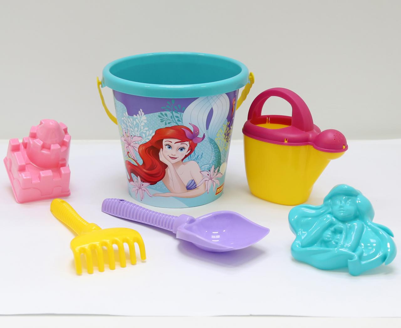 Набор Disney «Русалочка» №5: ведро большое с наклейкой, лопата №6, грабли №6, формочки (Ариэль + замок квадратный), лейка №10
