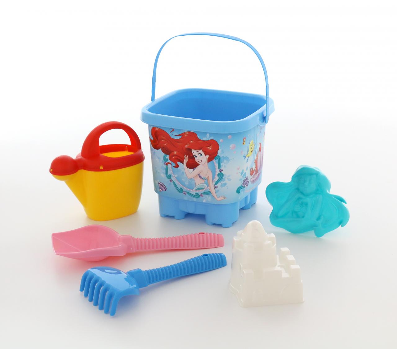 Набор Disney «Русалочка» №8: ведро-замок большое с наклейкой, лопата №6, грабли №6, формочки (Ариэль + замок квадратный), лейка №10