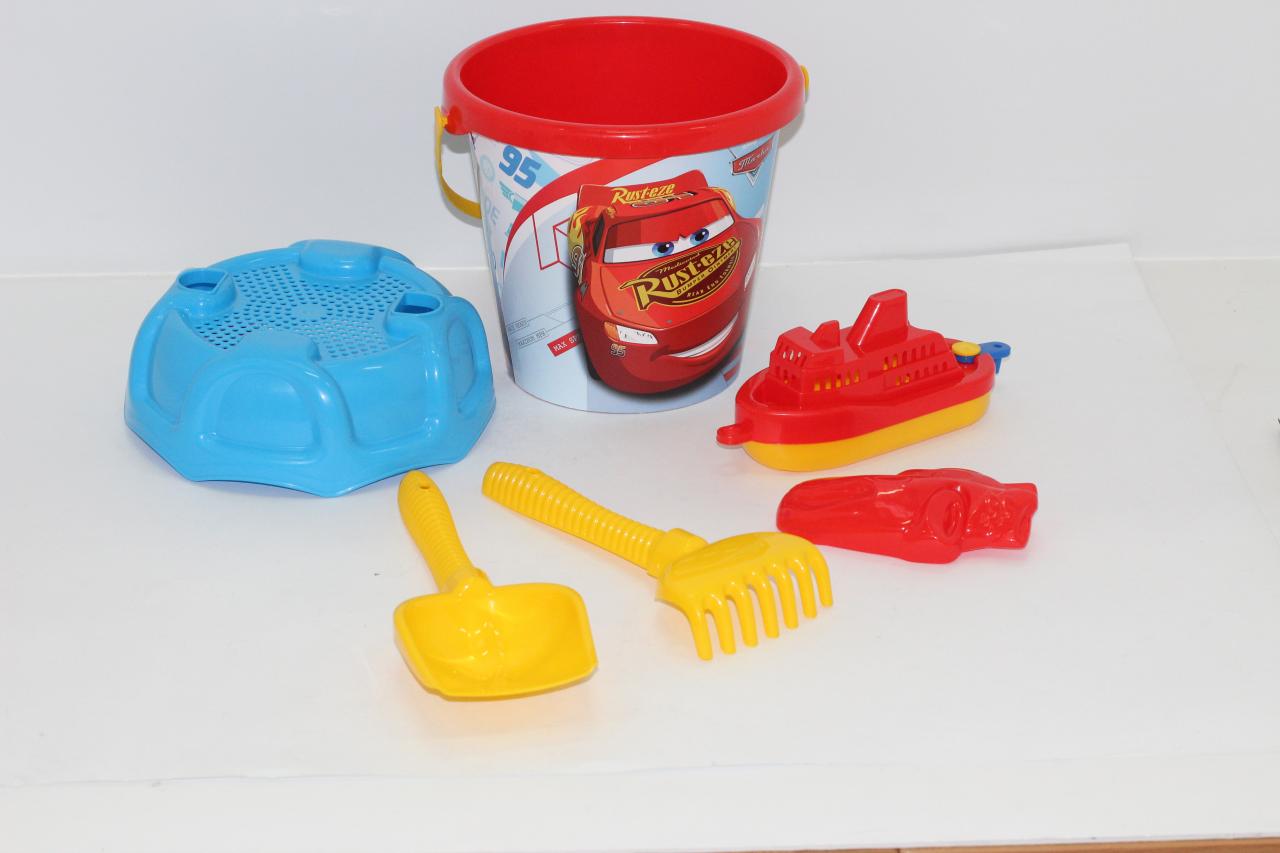 Набор Disney/Pixar «Тачки» №26: ведро большое с наклейкой, ситечко большое №3, лопата №6, грабли №6, формочка (Молния Маккуин), кораблик