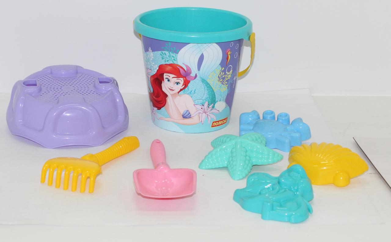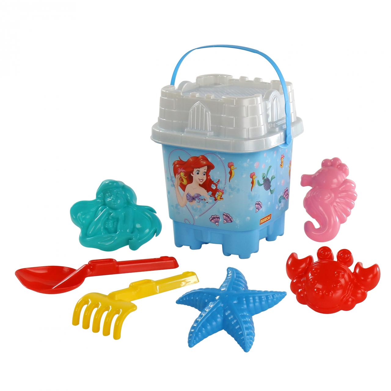 Набор Disney «Русалочка» №9: ведро-замок большое с наклейкой, ситечко-замок большое, лопатка №32, грабельки №32, формочки (Ариэль + краб №2 + морской конёк + морская звезда №2)