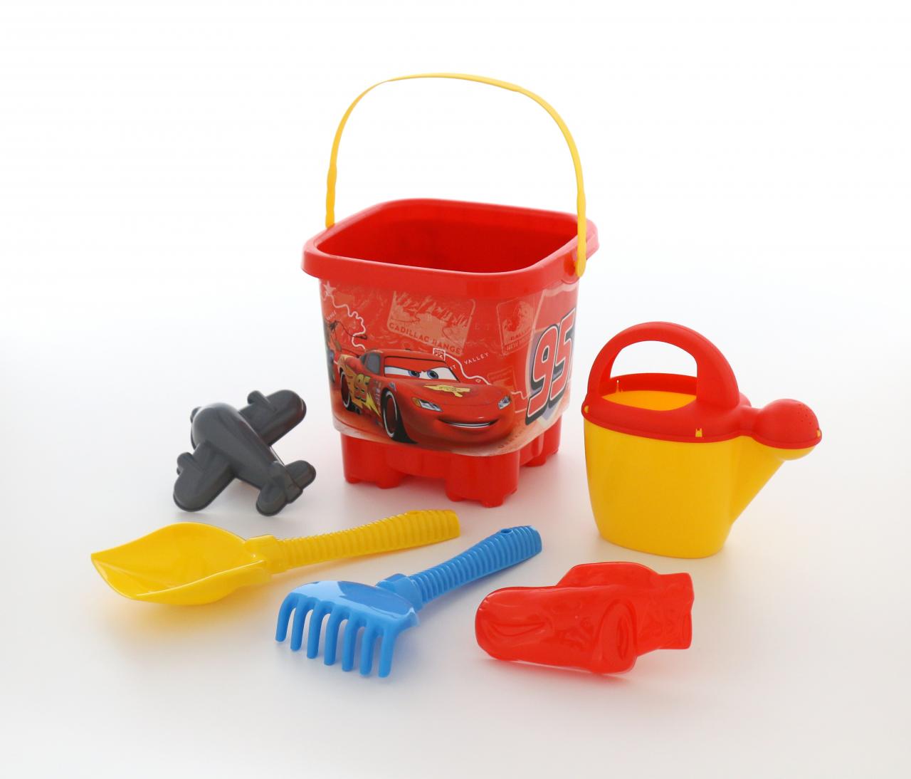 Набор Disney/Pixar «Тачки» №34: ведро-замок большое с наклейкой, лопата №6, грабли №6, формочки (Молния Маккуин + самолёт), лейка №10