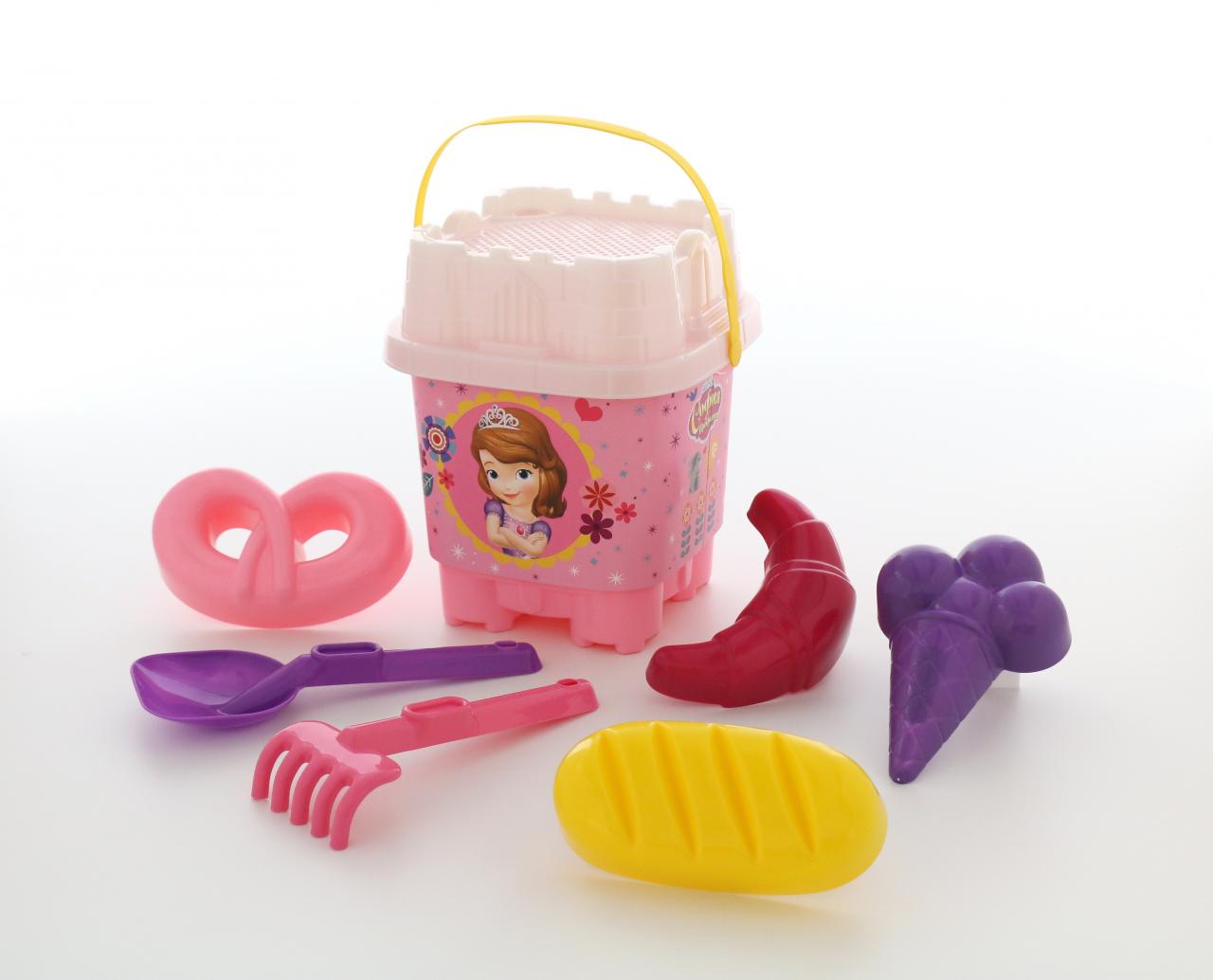 Набор Disney «София Прекрасная» №5: ведро-замок большое с наклейкой, ситечко-замок большое, лопатка №32, грабельки №32, формочки (мороженое + пирожок + крендель + рогалик)
