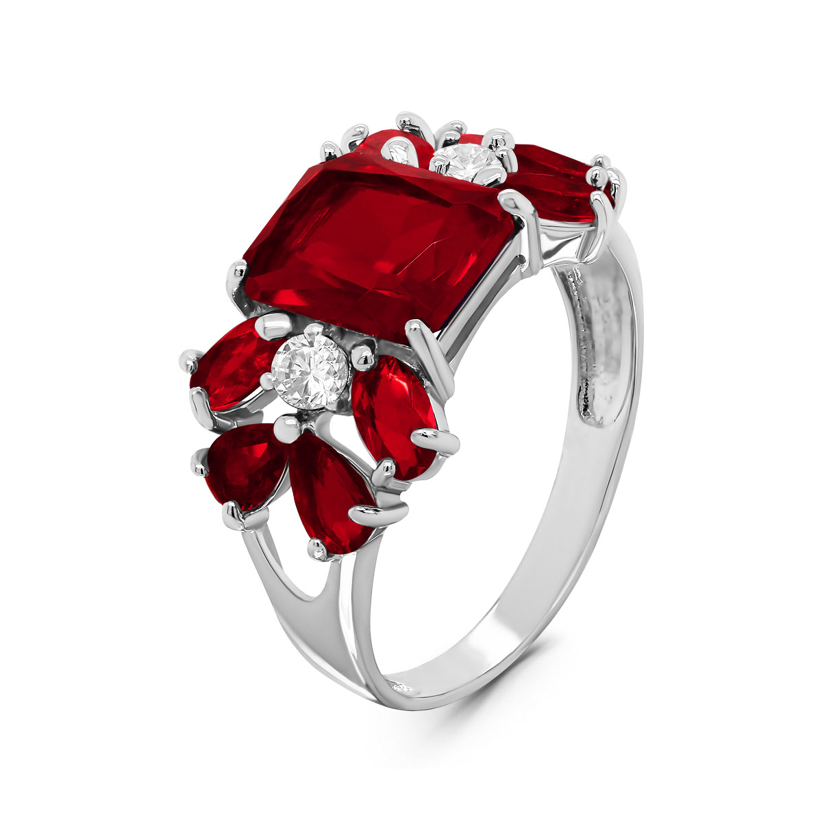 Кольцо из серебра с пл.кварцем цв.гранат и фианитами родированное