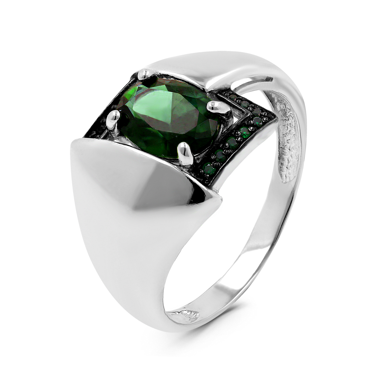 Кольцо из серебра с пл.зелёным кварцем и фианитами родированное