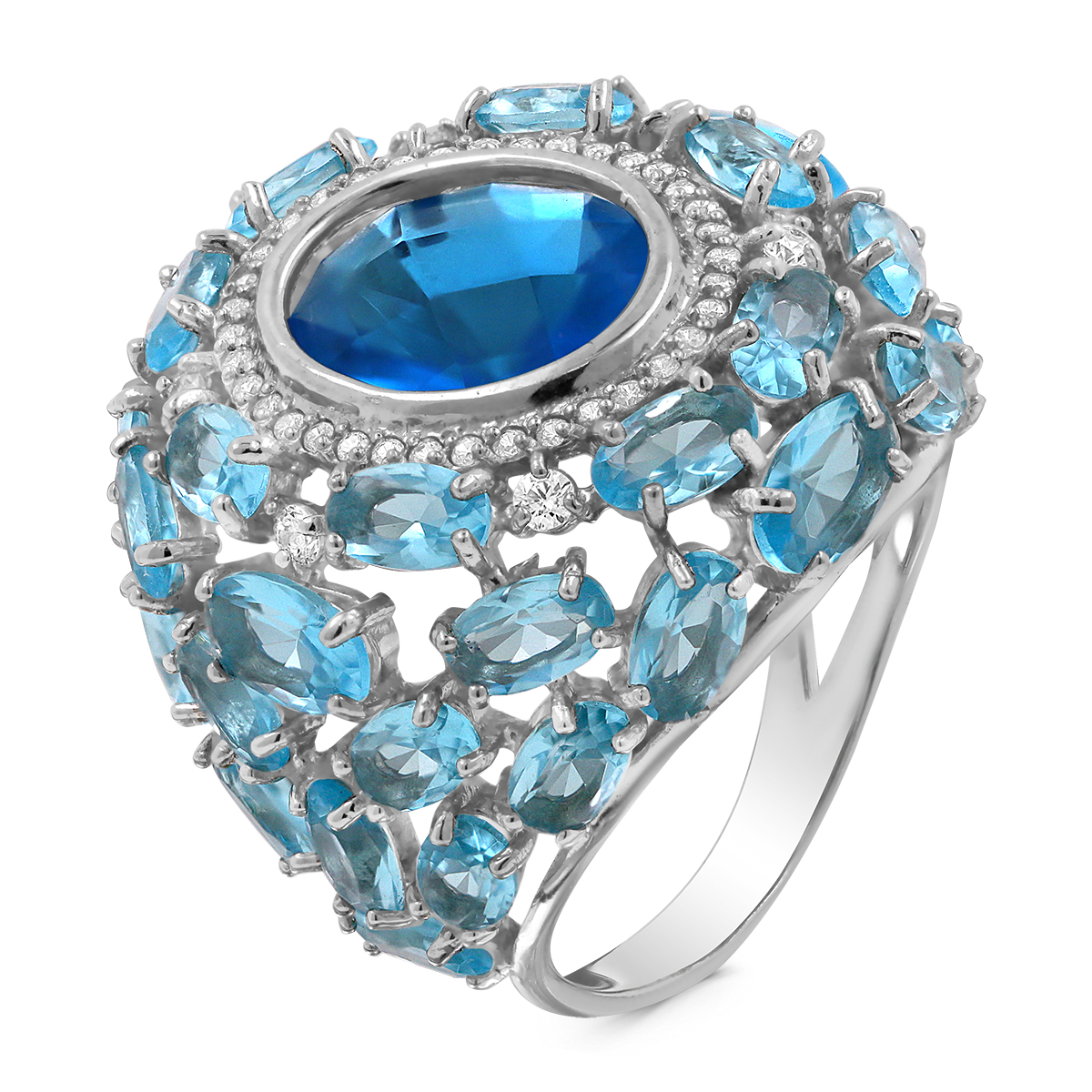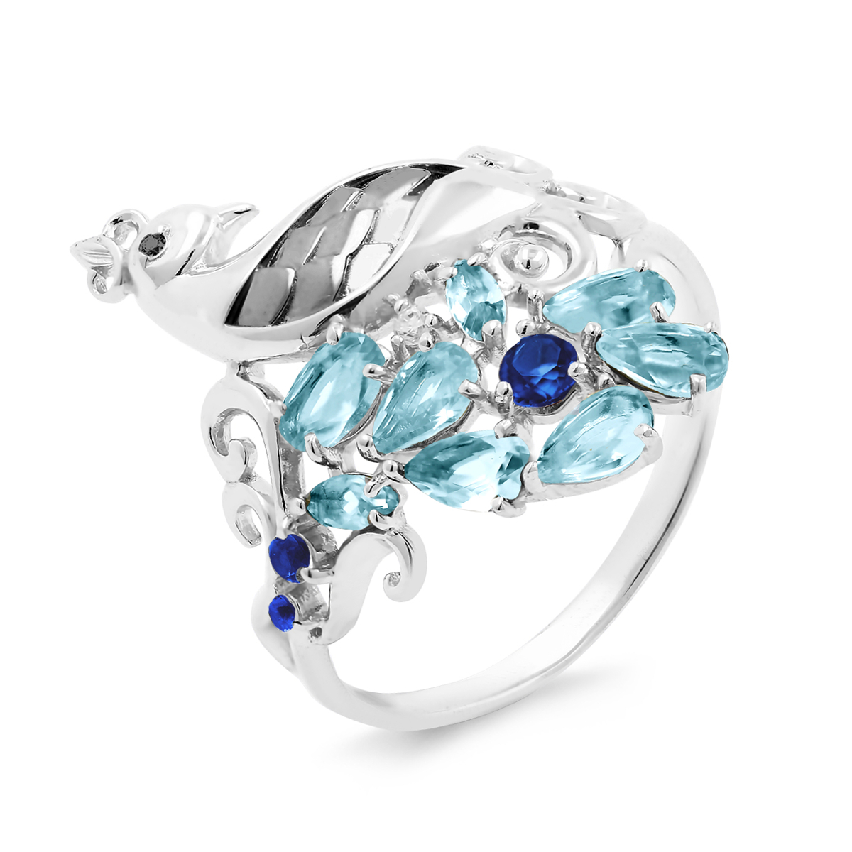 Кольцо из серебра с кварцем sky топаз, кварцем сапфир и фианитами родириованное - Павлин