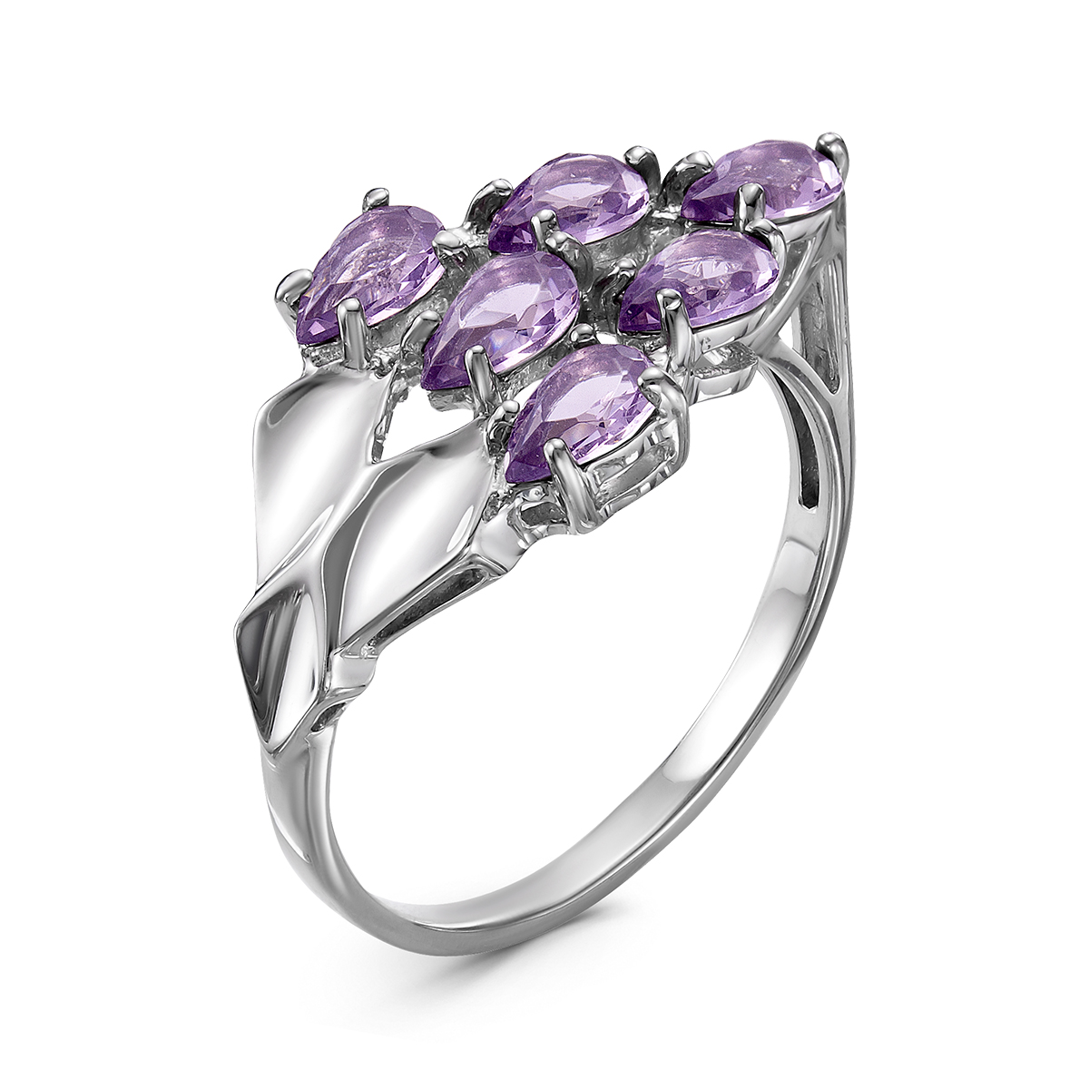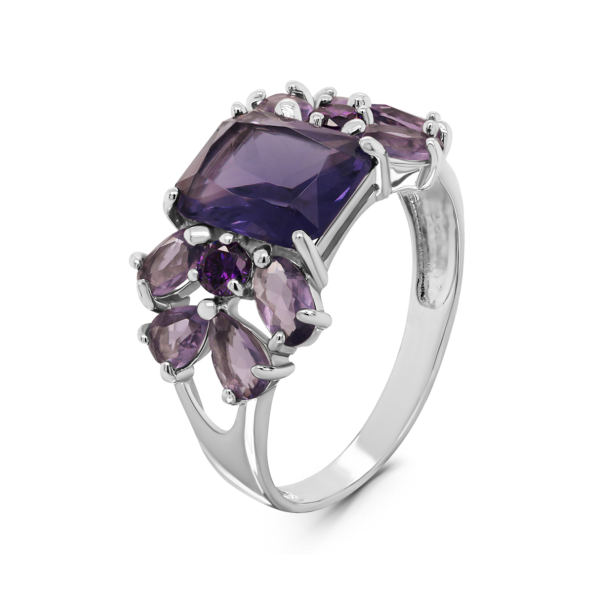 Кольцо из серебра с пл.кварцем цв.аметист и фианитами родированное