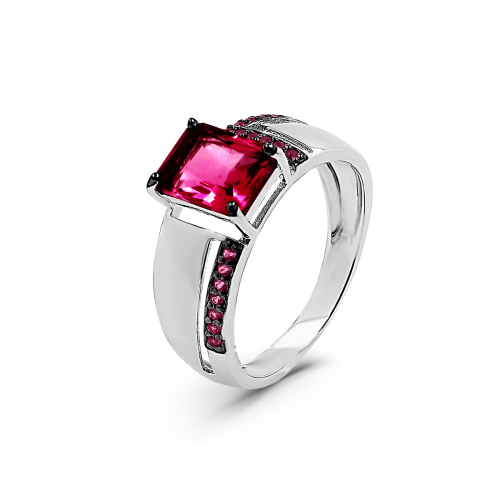 Кольцо из серебра с пл.кварцем цв.рубин и фианитами родированное