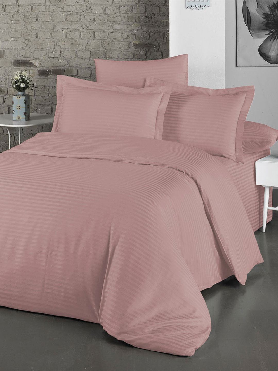 Постельное белье сатин страйп с простыней на резинке - Розовая пудра