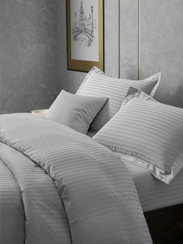 Постельное белье сатин страйп с простыней на резинке - Серо-голубой