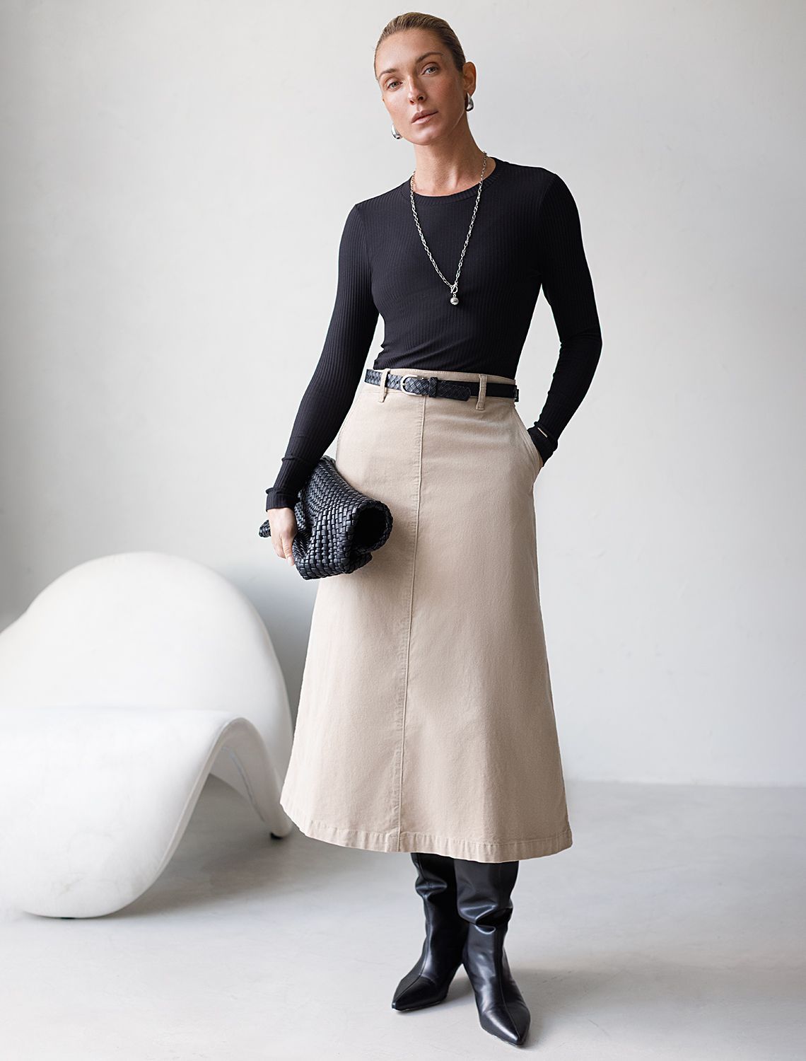 Юбка миди с разрезом из струящегося плотного сатина