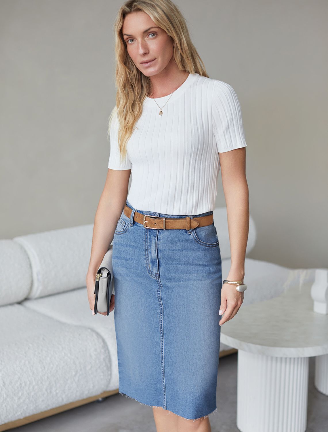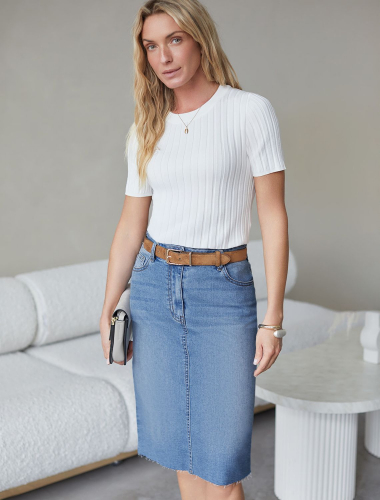 Джинсовая юбка миди с разрезом из эластичного облегченного денима D56.125 синий