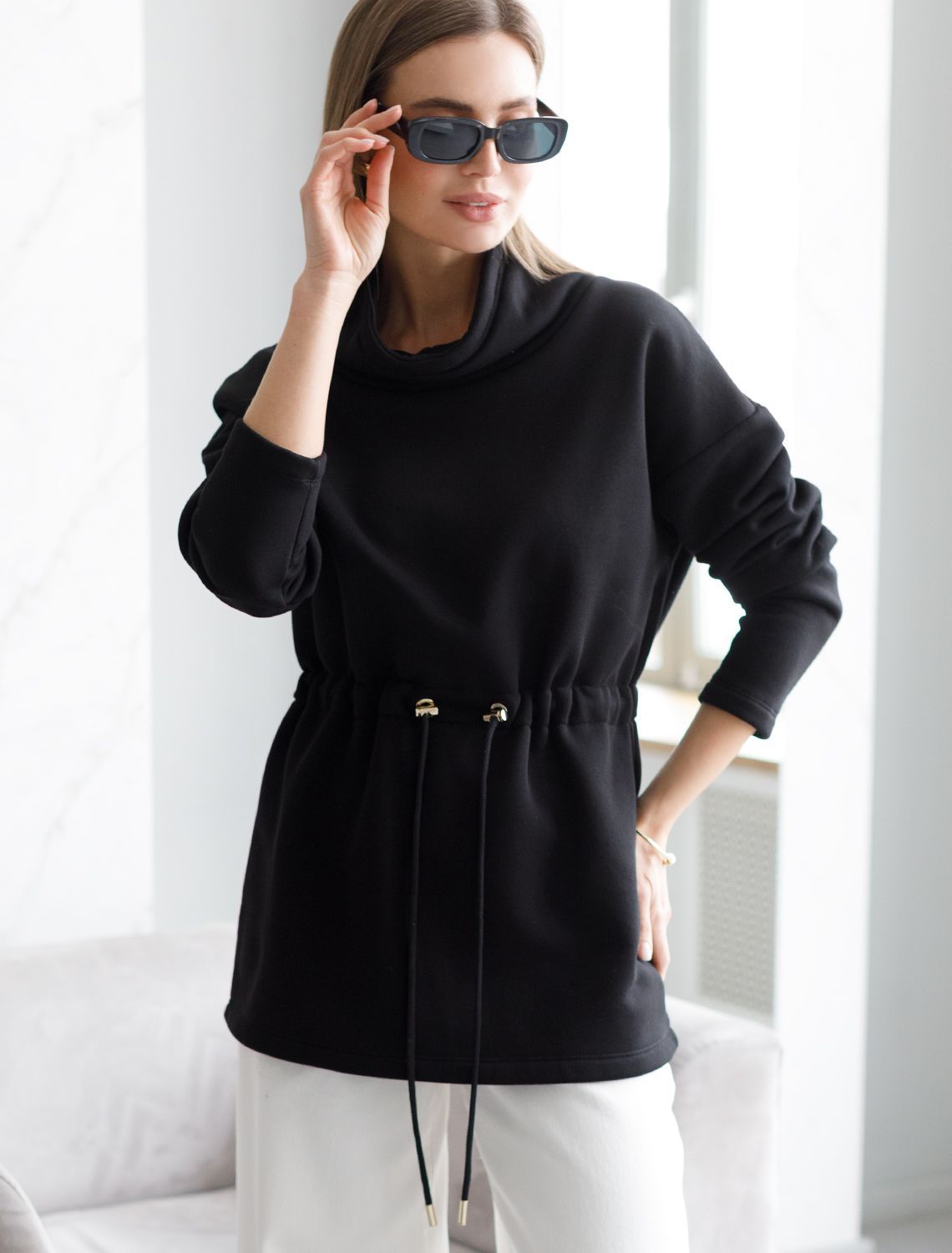 Джемпер с объемным воротом и шнуром на талии из футера-трехнитки D49.966 черный