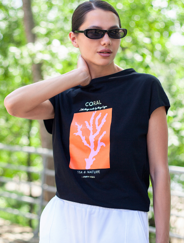 Футболка из хлопкового облегченного полотна с авторским принтом D49.020 черный_коралл