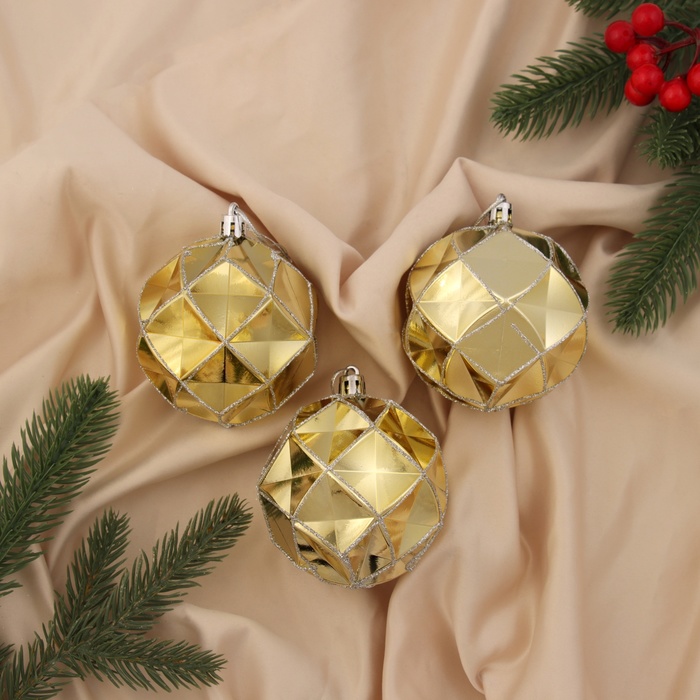 Ёлочные игрушки «Геометрия граней», шары новогодние, d=8 см, набор 3 шт., золото, МИКС